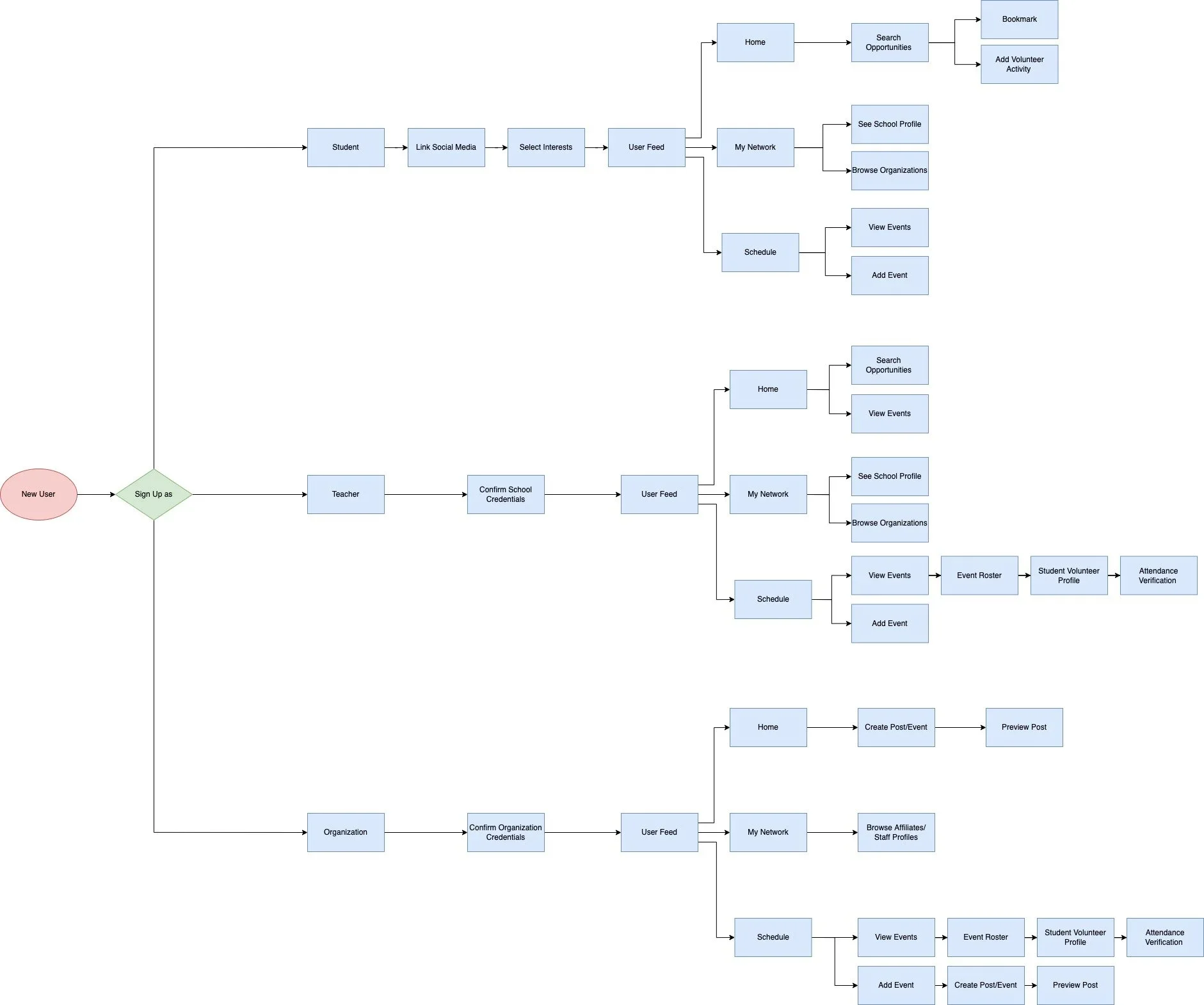 This flow for new users considers the 3 different types of users—student, teacher, organization.