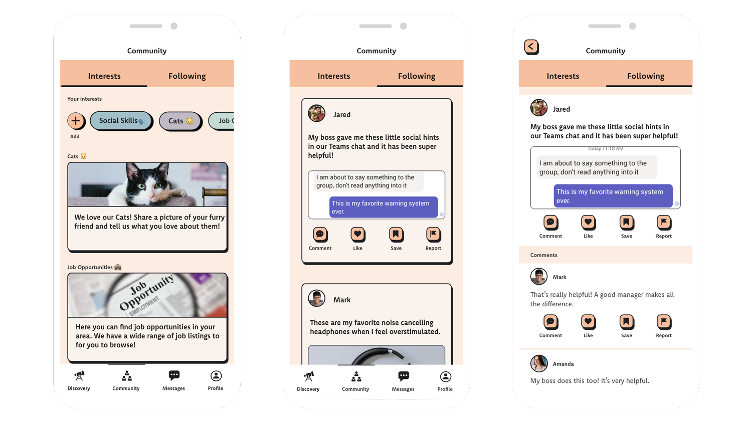 Users can engage with posts on the forums by liking and commenting. Engagement metrics would be hidden on user accounts to prevent social pressures allowing users to focus on making meaningful connections through shared interests and find resources devoid of distractions.